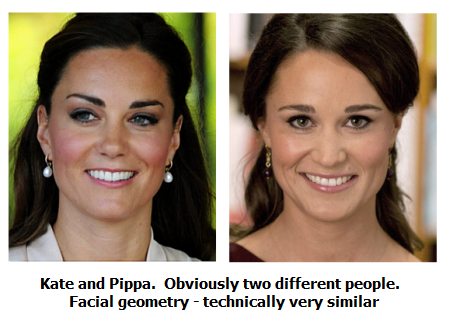 Kate and Pippa look very alike - with good reason, the geometry of their faces is very similar. But our eyes possesses the highly tuned skill of instant facial recognition.