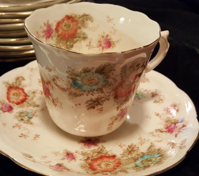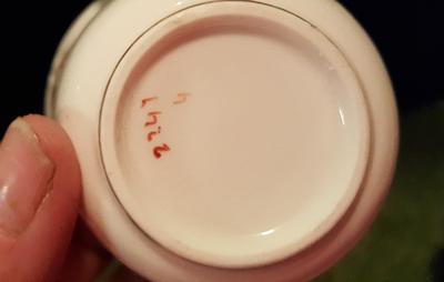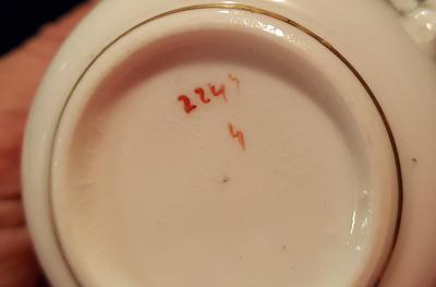 Hi my name is Kathleen Torkelson and recently i helped my nieghbor clean out her garage and in doing so she gave me this partial set of china. this is what she said," this was shipped over from England when her great grandmother move here to the states, and that these were her great grandmothers wedding gift." no i must tell you my nieghbor is 76 yrs old. they are hand painted the ONLY marks are the numbers 2247 4 or2244 4 i cant tell, and only on 3 tea cups nowhere else. its very delicate and when you hold it to the light is transparent. i would like to sell these but i cant find any info on them any where. ive tried replacments ltd , ebay, and you guys so here hoping.