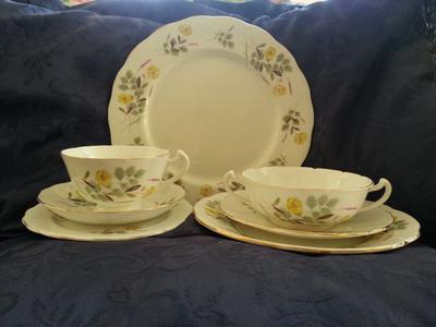 This lovely little dinner set was a present from my husband's Godmother for his 21st birthday in the 1970's. We really love it. Such a gentle pretty pattern of buttercups. It has indented gold edges. It is a 7 place setting with (originall) 6 settings.