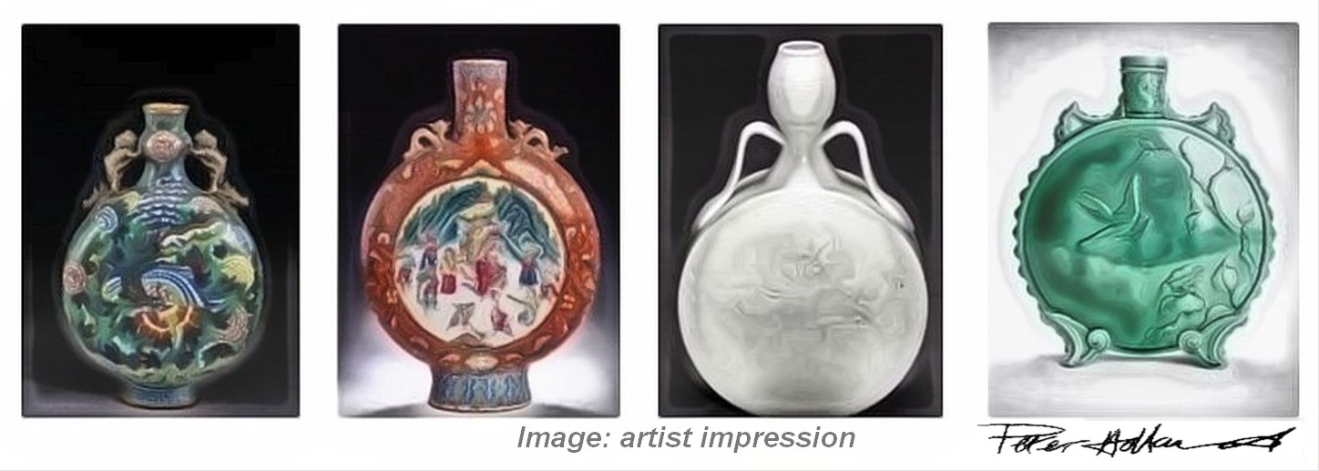 Moon Flasks in a sophisticated form of porcelain or pre-porcelain were first produced in the Ming era. Based on vessels from the Middle East, they were brought to China through traders.