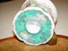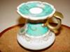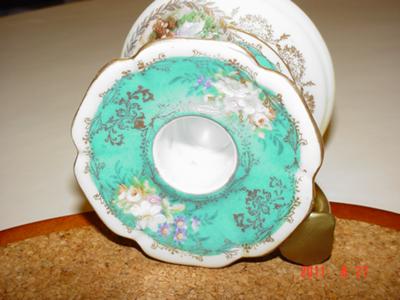This candlestick, regardless of it path down through history is quite pretty, now that I look it over again some years since and is in quite nice shape except for the piece that is at the top of the handle. Looks like it may have been in the shape of a leaf?? Don't know but it is obvious it was broken but my mother, being an artist and have gold paint in her wares, somehow smoothed the rough edges and painted over the place damaged.