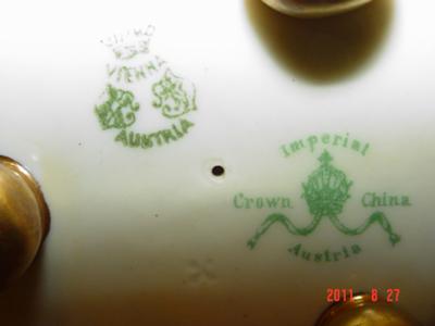 "Imperial Crown China Austria" Candle holder with 2 pottery marks:- This candlestick holder is in my possession as handed down from my mother. She had an uncle, Joseph Simms, who travelled the world, lectured in several countries. He was a civil war veteran, graduate of Columbia Medical School, a physician, and then became something called a physiognomist.