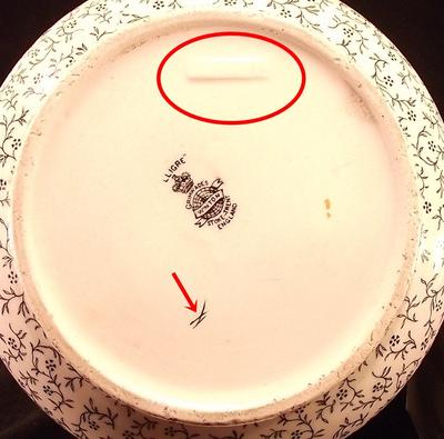 Pic 3 shows the bottom. There is a raised rectangle that has a faint impressed number in it. The arrow points out a mark that seems to be intentional. Pic 4 shows what I would think is a pretty major firing flaw on the inside wall of the pot.