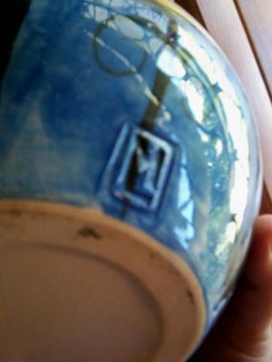 I'm very keen to identify this unusual mark. It looks like an 'M' with an 'L' laid over it on the left hand side and then a line around the outside of it. It is heavy pot with some crazing but otherwise perfect condition.