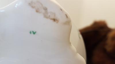 The greatest challenge has been not knowing where to start, it looks hand painted and has very ornate handles and finials but is pottery and not china. There are no makers marks on it other then the green letters or they could be Roman numerals and they are only on certain pieces; tea pot, milk jug, sugar bowl. The tea pot spout looks like a dragons head, I have tried to show this in the photographs, as mentioned I believe it is pottery and therefore the casting of the finials and handles is not particularly fine.