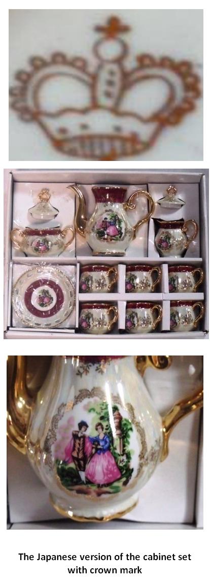 Subsequently, following clues given by contributors to this thread I have been able to write up a report below which concludes that we are talking about two different makers marks here, using a single crown on similarly themed cabinet style tea sets. One of which is Gräfenthal, East Germany post 1972 and the other is from Japan from the 1950's - 60's. See my report below for more details.