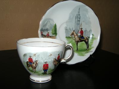 Mine is one with Canadian Mounties and the word Canada marked on the cups and saucers.