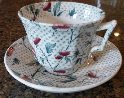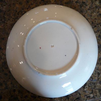 Good Evening. I just found your website while trying to find clues to the background of my china cups and the back stamp. I found six matching cups/saucers on a dusty shelf, buried and forgotten, in a junk store in Nashville, about a year ago. Probably not extremely valuable, but in their own way, beautiful survivors of time and unknown circumstances. Based on my experience I know these have to be old. I could imagine Thomas Jefferson using these while reading his evening paper. I love Georgian/Federal era antique china, glass and silver and I love treasure hunting. One of my other favorite pieces is a poor little deep dish saucer, beautifully hand painted with tiny flowers that make a monogram design in the center and back stamped with the Royal Vienna beehive. The real one. It was broken and poorly, though probably lovingly, re-glued but it is still beautiful. It is true Royal Vienna and the impressed back stamp date was dated to 1789, the year of our first Presidential Election in the US and the date Mary Antoinette met an unfortunate end. The Royal Vienna Factory was under the ownership of Austrian Empress Maria Theresia, her mother. Makes one wonder how this came to be in Tennessee, how and when was it broken, who owned it and why was it "saved"? I feel like I am rescuing art forms, and the hard work of some unknown artist, that could end up broken, discarded or under appreciated. I have over the years collected so many things... alas my poor husband said "some have to go if you want to buy more". So I became an antiques dealer and, sometimes begrudgingly, sell some things to finance buying "new things". Antique hunting has provided such an education about people, places and the history of so many items we take for granted. I am now researching sailing history i.e.: "The Cutty Sark" because I think I have the c1860's Glenock Scotland silverplated Whist "Winners" Trophy the designers/owners passed among themselves each year. I love using an antique item and marveling at how it was made, the workmanship and talent that went into it. How difficult it must have been to acquire the resources in the 18th century colonies. I marvel at the skill and labor that went into it. Can you imagine blowing glass in the 18th century by firelight & oil lamp? How many broke before a successful one was made? I wish a course on antiques had been taught in my High School; it would have made me much more interested in history! My mystery piece is a set of six cups/saucers with blue and white applied printed design. The design looks to be "folded over" into the inside of the cup. Based on the irregular placement of the print, the design of the cup, the crackle, it looks OLD to me. Unlike the Royal Vienna piece, this set looks, hand made yes, but mass produced and "quickly" done. Not your "fine china". The cups do have handles and are 3" tall x 3 1/4 (approx) diameter across the top. The saucers are about 5 1/2" diameter. Not the dainty little things made just for the ladies but definitely a period tea cup that the "man of the house" would feel comfortable handling. Were these made in England or China? Can you imagine, these cups arrived in America on a wooden SAILING ship? The only mark I see is 5 red dots in a square like on dice. A couple of the saucers also have what looks like an impressed 13 in the body. I am not sure how early potteries were using decal printing in lieu of "painting" glazes for decoration. I have a bookshelf of books and searched the internet, I can not find a back stamp of just 5 red dots. On another note, I collect Georgian and Early Federal Brooches as well as some Victorian. I just started designing jewelry in which I incorporate (without damaging them) these into beautiful necklaces that can be worn today. I am FabulousFamilyTreeHeirlooms and will be posting some of my creations next week or so when I finish putting together a collection and photographing them (and when I fix the website photo problem.) It seems a shame to have these beautiful objects just stored away out of sight when they could be worn but ladies don't seem to wear brooches that often today. We have also launched Burwoodhall Country Estate B&B Thompsons Station TN on our 12 acre farm. I built the house after Mount Vernon and similar Federal Era Buildings.
